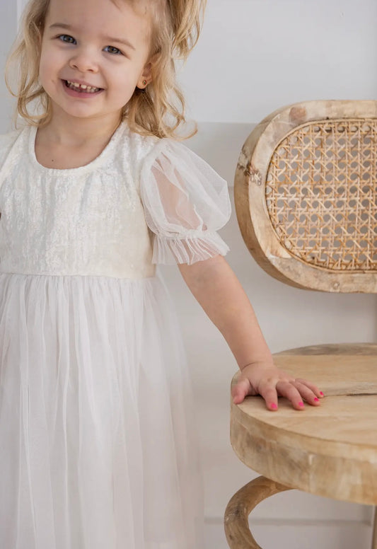 White Tulle & Velvet Puff Sleeves Gathered Dress