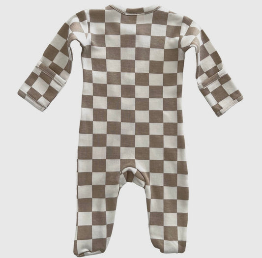One Piece Tan Checkerboard Footie with Fold Over Hand Cuff