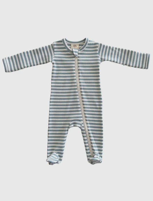 Sold outDusty Blue Stipe Ribbed Zip Footie