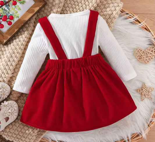 Christmas Red Velvet Bow Suspender Dress With White Onesie